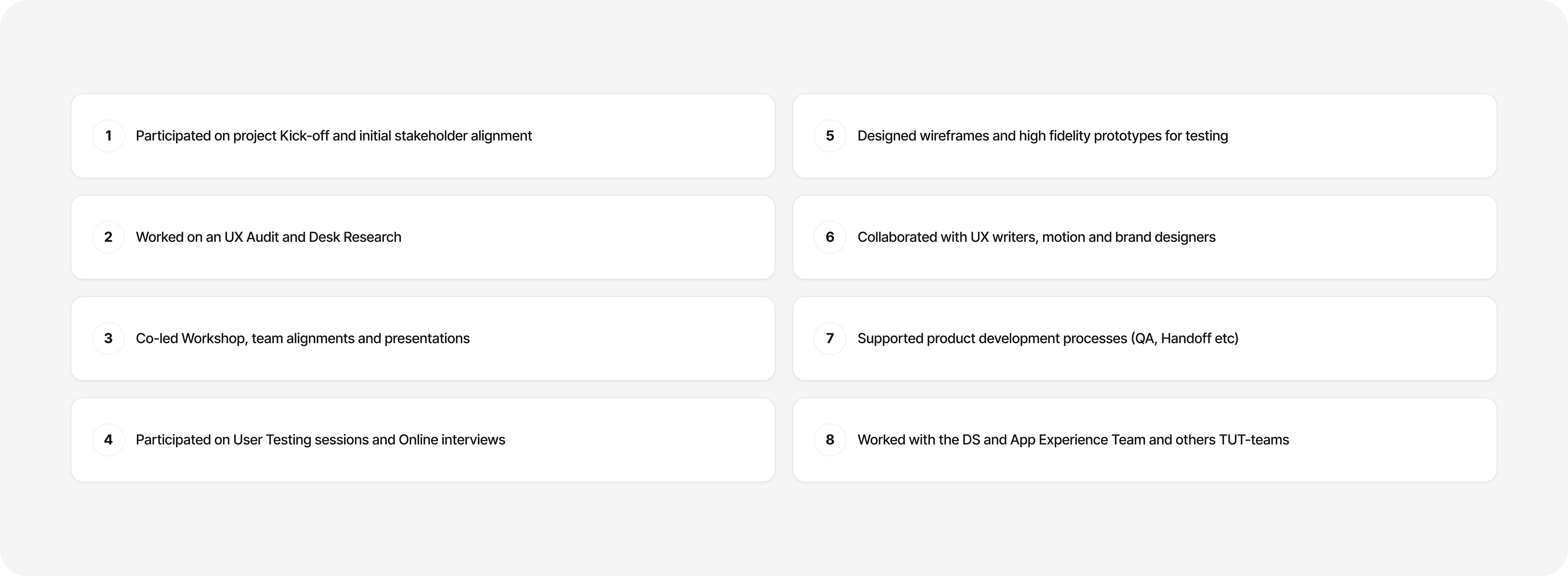 1. UX audit and Desk research: Identified areas for improvement in the current version and conducted desk research to gather existing insights and industry best practices.